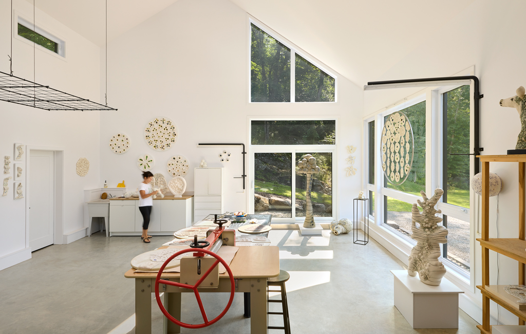 L’atelier, pour sa part, en plus de voir sa superficie augmenter, se pare d’une fenestration ouvrante et d’un rangement optimisé. Cette pièce, élément contemporain central, lie élégamment les deux volumes qui le juxtaposent de chaque côté. Au-dessus du garage existant, une terrasse est aménagée afin d’offrir aux résidents un espace extérieur où se détendre, caressés par les rayons de soleil et la brise du vent.
