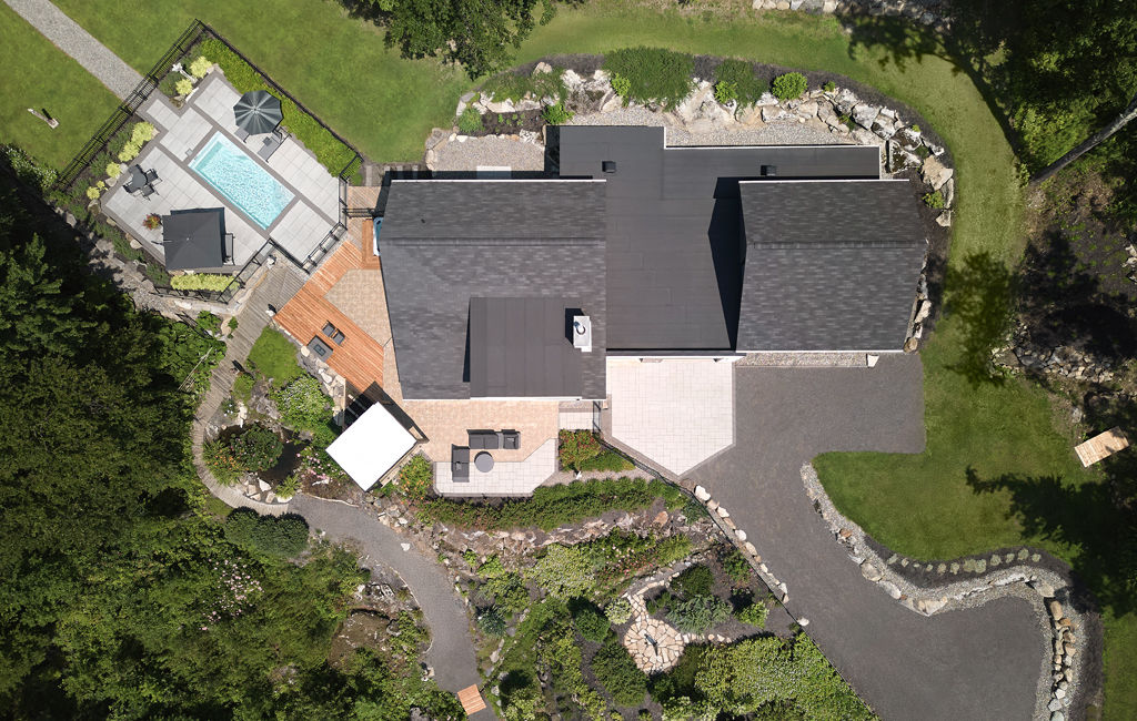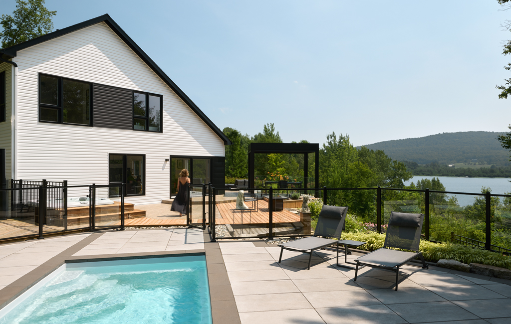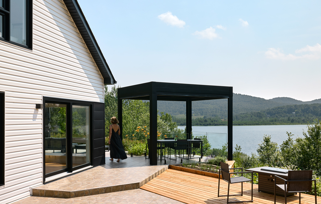 De style transitionnel, cette demeure se veut être un havre de paix et de lumière. Toutes les façades ont d’ailleurs été pensées afin d’offrir aux résidents des vues saisissantes sur le paysage et le lac qui le borde. L’ajout de la lucarne contemporaine permet justement l’aménagement d’un bureau avec lumière et vue sur le lac.